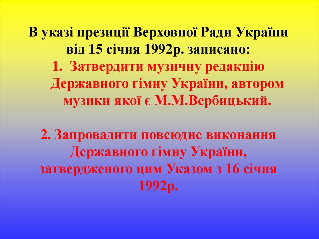 Державним гімном є пісня «Ще не вмерла України і слава, і воля»: слова Павла Чубинського, музика Михайла Вербицького. Офіційна музична редакція ухвалена Верховною Радою 15 січня 1992 року, текст гімну затверджено законом України «Про Державний гімн України» 6 березня 2003 року. Державний Гімн України — один із головних державних символів України поряд із прапором і гербом.